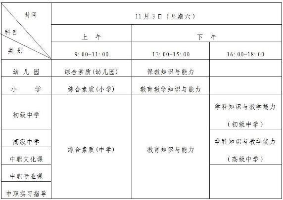 考试日期为2018年11月3日,各科目考试时间为120分钟,全部为纸笔考试。具体时间安排如下: