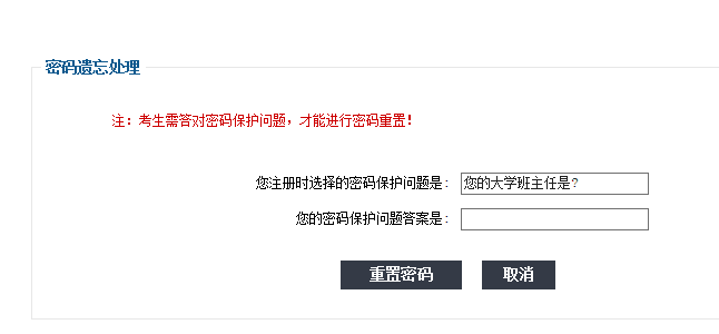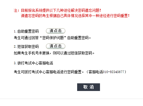 自助重置密码是在考生们首次设置密码是会有一个密保问题,在选择密保问题时,考生可以选一个自己容易记住的问题,这样在找回密码时会快上很多!考生考生们忘记密保问题,还可以用短信获取密码哦!
