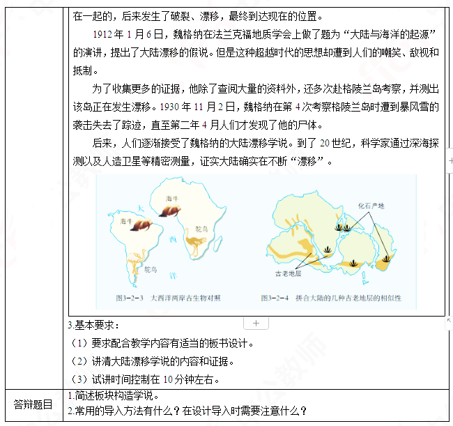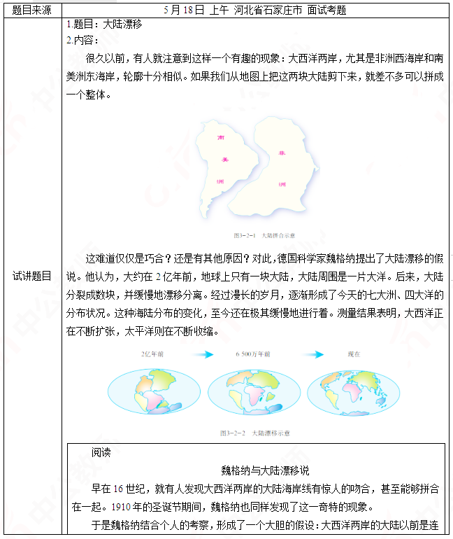 2019年上半年山东教师资格证初中地理面试试讲真题:《大陆漂移》