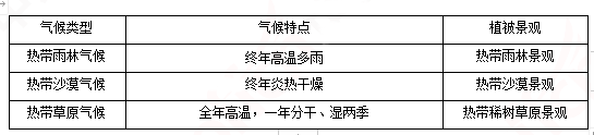 教师展示撒哈拉以南非洲的气候类型图,学生总结出非洲主要气候类型为热带沙漠气候、热带雨林气候、热带草原气候,学生结合不同气候的景观图完成以下表格。