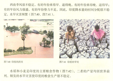 教师总结:在雨季,影响印度的西南季风非常不稳定,有的年份来得早,退得晚,有的年份来得晚,退得早;有的年份风力强盛,有的年份势力不足。所以,印度的降水量时间分配不稳定,水旱灾害频繁,而这也影响了印度农业生产的稳定。