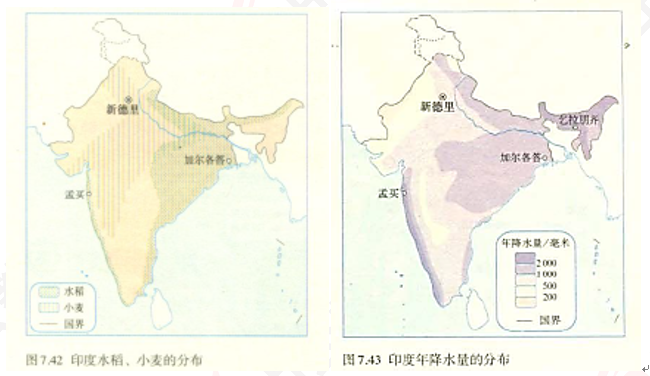 3.对照图7.42与图7.43,说出印度水稻和小麦主要分布区的年降水量差异。