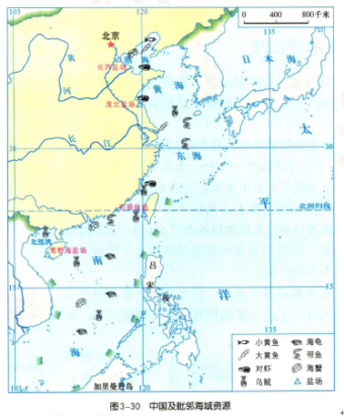 【教师活动】展示图片“中国及其毗邻的海域资源”,引导学生读图并思考:我国的海洋生物资源十分丰富,我国有哪些主要的海产?结合图片思考我国的海洋生物资源为什么这么丰富?