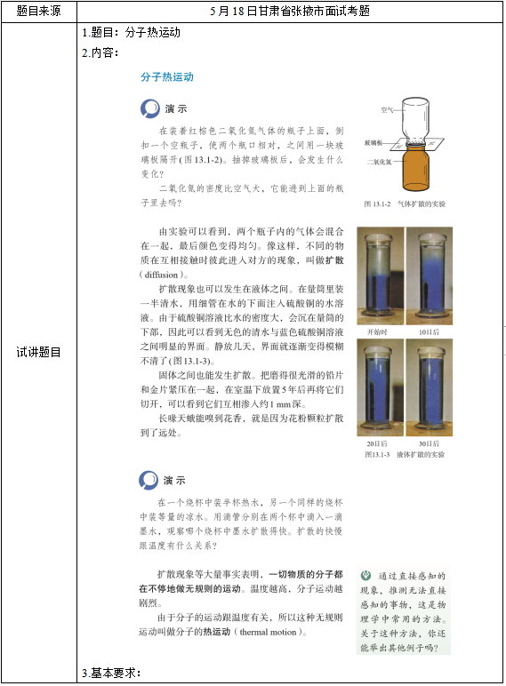 在讲授分子热运动这一知识点的时候,我用了大量的直观的物理演示实验和多媒体辅助,包括花露水和二氧化氮气体分子的直观扩散,硫酸铜溶液与水的缓慢液体扩散,视频展示的煤炭堆、金片和铅片的互相渗入等现象的固体扩散,由现象分析内在的本质,让学生明白一切物质的分子都在不停地做无规则的运动。 这样用大量的实验现象和生活现象的融入,不仅可以强化学生的认知,对气体、固体、液体分子的扩散现象有一个系统的了解,还能培养学生观察、思考、总结的能力,突出教学的重点。