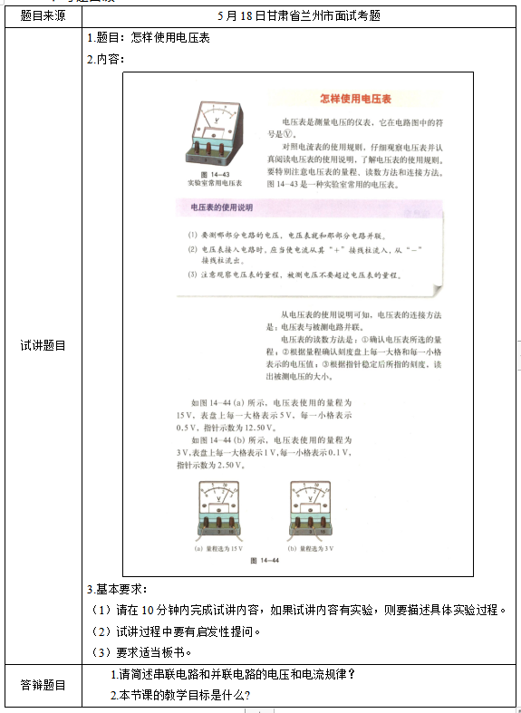 2019上半年山东教师资格证初中物理面试试讲真题:《怎样使用电压表》