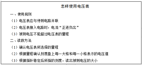 1.教师展示电压表实物,引导学生观察电压表各部分结构。接着再认真阅读电压表的使用说明,并请学生代表尝试归纳出电压表的使用规则:(1)电压表应与待测电路并联。(2)电压表接入电路时,电流应从“+”接线柱流入,从“-”接线柱流出。(3)被测电压不能超过电压表的量程。