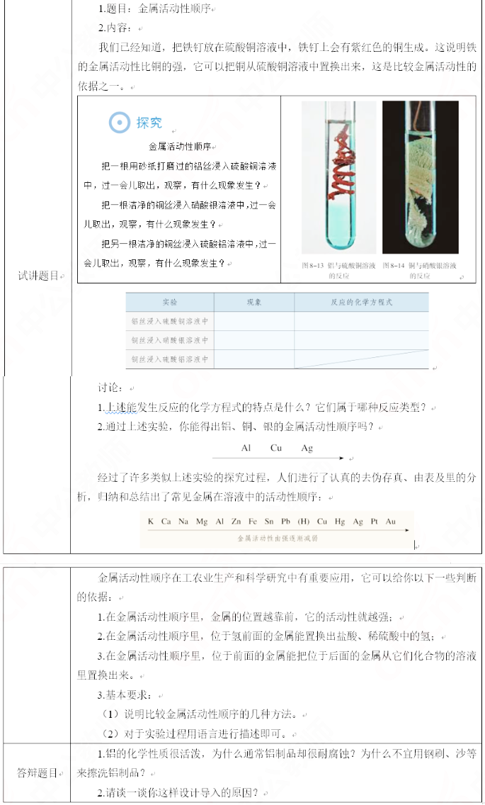 2019上半年山东教师资格证初中化学面试试讲真题:《金属活动性顺序》