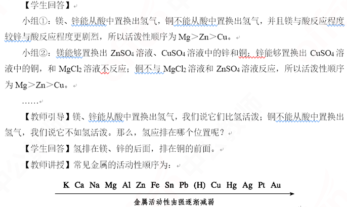 【学生回答】铁比铜活泼,因为铁与盐酸发生了反应,有气泡产生,而铜与盐酸不反应,并且铁能把铜从硫酸铜溶液中置换出来,说明铁更活泼。