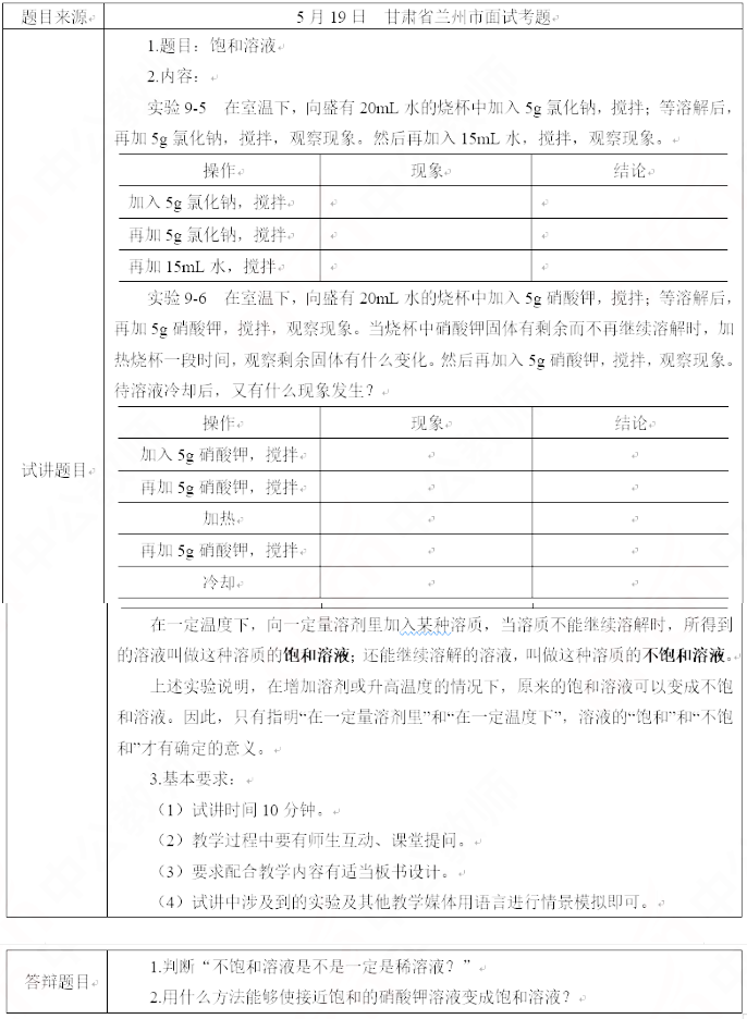 2019上半年山东教师资格证初中化学面试试讲真题:《饱和溶液》