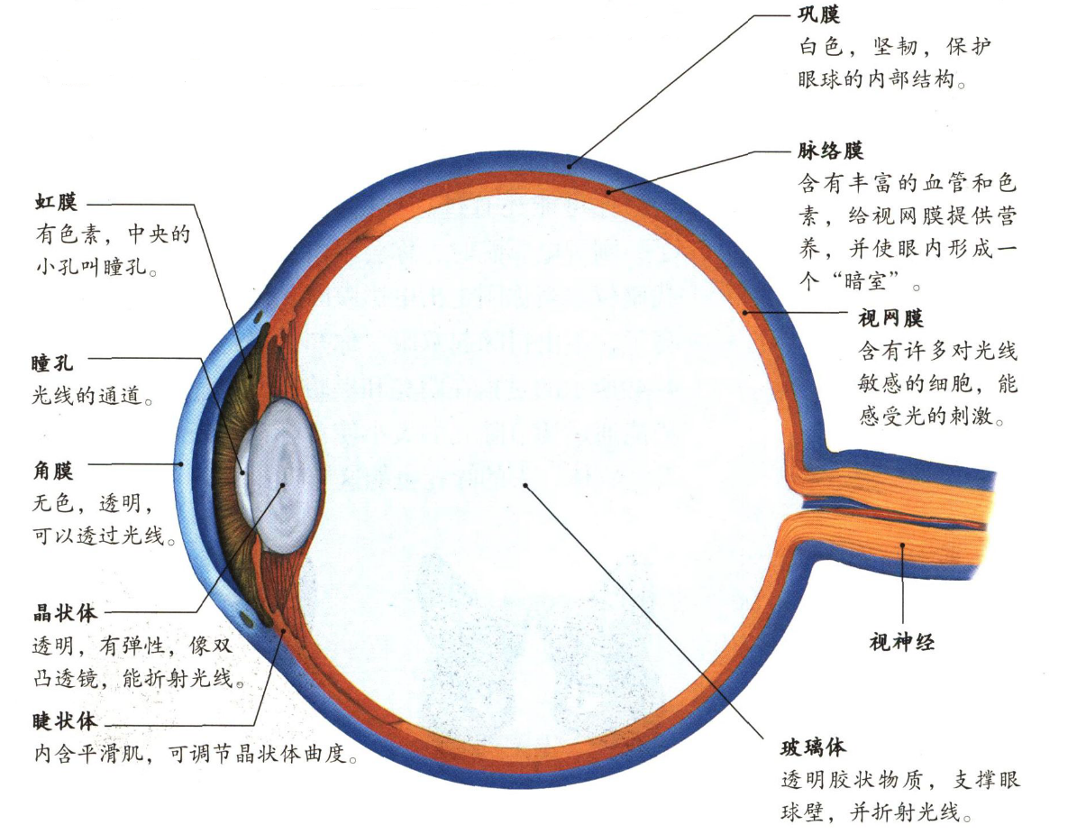 角膜:位于眼球最外部,无色、透明,可以透过光线。