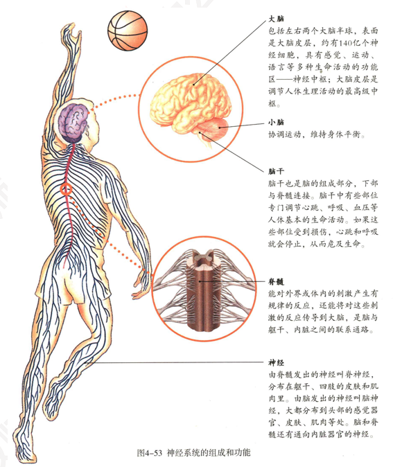 上述资料介绍的病例,分别涉及脑(brain)、脊髓(spinal cord)、或神经(nerve)的损伤,说明感觉、肢体运动、内脏器官的活动都与神经系统有关。神经系统是由脑、脊髓和它们发出的神经组成的(图4-53)。