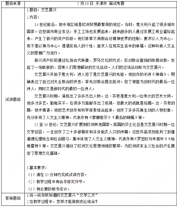 2019上半年山东教师资格证初中历史面试试讲真题:《文艺复兴》
