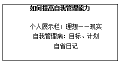 经过大家的讨论和分享,我们已经找到了现实与理想之中,存在的差距与不足,这是我们要提高自我管理的第一步,对于自己要有明确的认识。认识了自己以后,如何解决存在的问题呢?