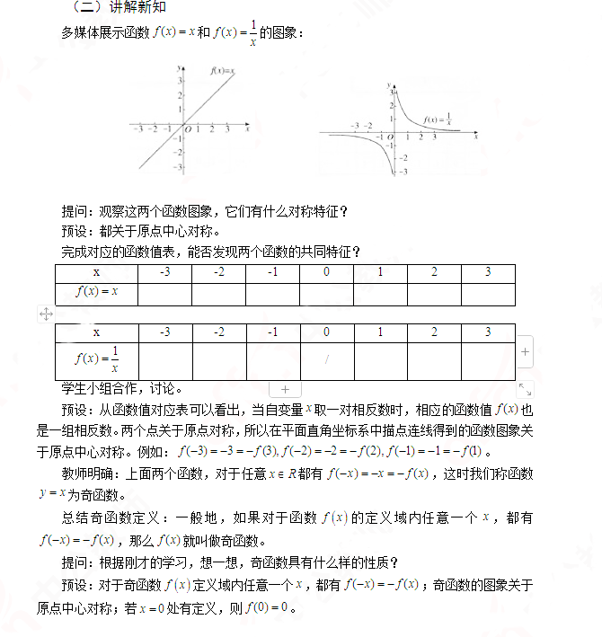过程与方法:经历奇函数概念的形成过程,体会从特殊到一般的数学思想方法,提高分析问题、解决问题的能力。