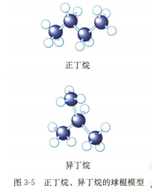 甲烷、乙烷、丙烷的结构各只有一种,而丁烷却有两种不同的结构(如图3-5所示)。虽然两种丁烷的组成相同,但分子中原子的结合顺序不同,即分子结构不同,因此它们的性质就有差异,属于两种不同的化合物。分子里碳原子相互结合形成的直链丁烷,称为正丁烷,分子里碳原子相互结合形成的带支链的丁烷,称为异丁烷。