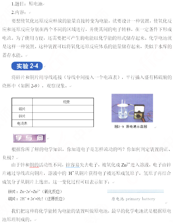 【教师讲解】在原电池中,用还原性较强的物质作为负极,负极向外电路提供电子;用氧化性较强的物质作为正极,正极从外电路得到电子;在原电池的内部,两极浸在电解质溶液中,并通过正负离子的定性移动形成内电路。放电时,负极上的电子通过导线流向正极,再通过溶液中离子形成的内电路形成环路。(教师合铜锌原电池装置图进行讲解。)