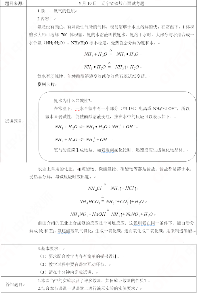 2019上半年山东教师资格证高中化学面试试讲真题:《氨气的性质》