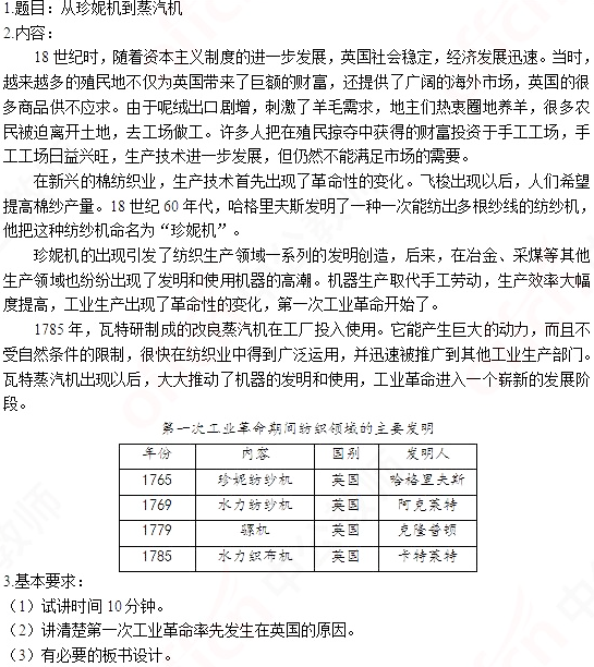 2019上半年山东教师资格证高中历史面试试讲真题:《从珍妮机到蒸汽机》