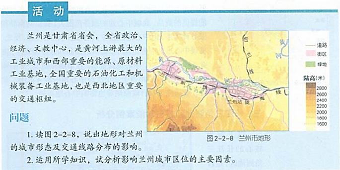 1.读图2-2-8,说出地形对兰州的城市形态及交通线路分布的影响。