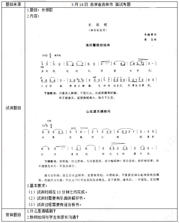 2019上半年山东教师资格证高中音乐面试试讲真题:《长恨歌》