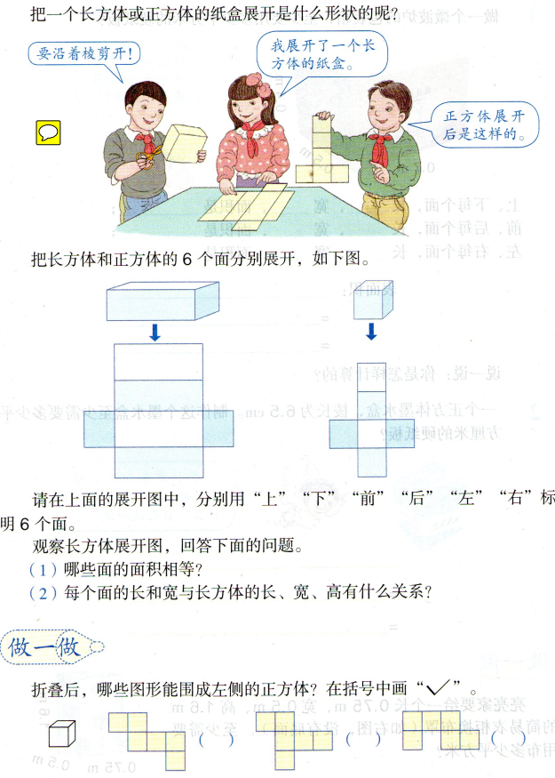 引导学生小组合作,在展开图中标出原来长方体、正方体的上、下、前、后、左、右6个面,并观察。