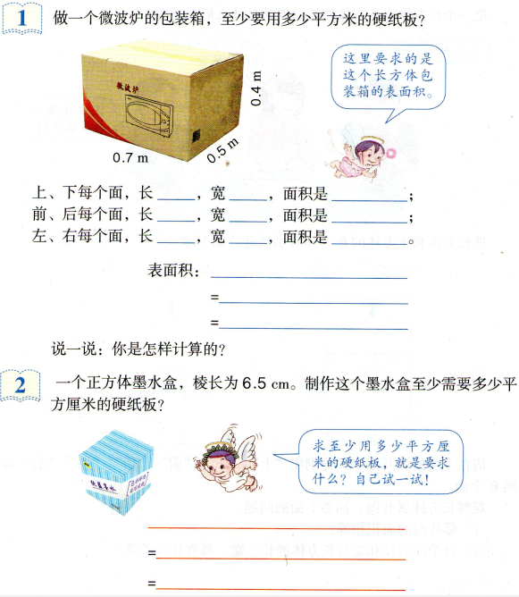 引导学生通过合作,自己去探求正方体表面积的计算方法,通过对微波炉的包装,引导学生掌握正确计算长方体面积的计算方法。