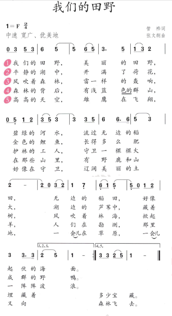3.教师总结:《我们的田野》是一首描写田野美好风光的歌曲,歌词写到美丽的田野,碧绿的小河,巍巍的群山,金色的鲤鱼,成群的野鸭,从远写到近,从静写到动,从地面写到天空,优美动听的曲谱和生动形象的歌词融合在一起,正如一幅幅美丽状观的山水彩画描绘出祖国山河的无比美丽。