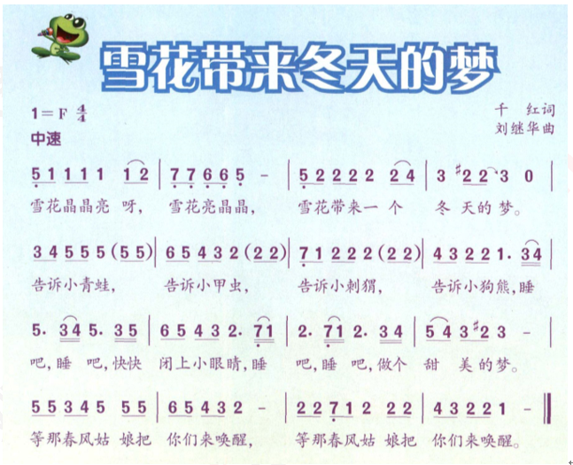 7.教师引导学生有节奏地朗读歌词,同时带上指挥手势并注意弱起处,再说出从歌词中体会到的内容及情感,说出雪花和梦的联系。师生交流并总结,并得出结论:冬天下起洁白的雪花,而小动物们伴随着这漫天大雪进入甜蜜的梦乡。