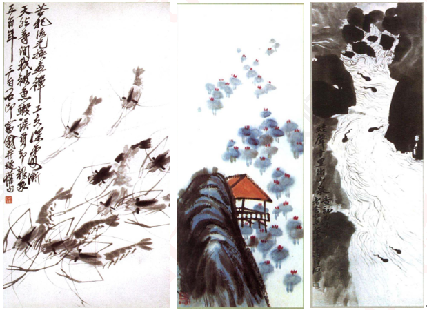 群虾(中国画)1934 (图1) 竹楼荷塘(中国画)1913(图2) 蛙声十里出山泉(中国画)1951(图3)