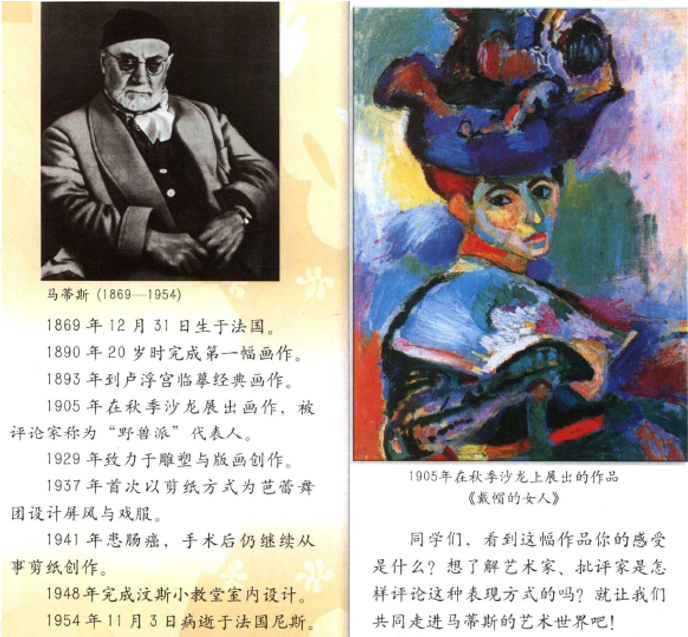 老师简述马蒂斯的生平,并引导学生思考我们在马蒂斯身上可以学到什么?
