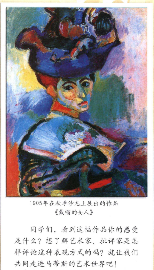 故事导入,教师讲述故事,马蒂斯在《戴帽的女人》第一次展览时不被大家接受,有位女士很不理解这种风格,于是去问马蒂斯“先生,难道在你的眼里我们女人就长这个样子么?”。马蒂斯说“这位夫人,那不是一位女士,那是一幅画。”此时教师提出问题,同学们你们见过这幅画么?