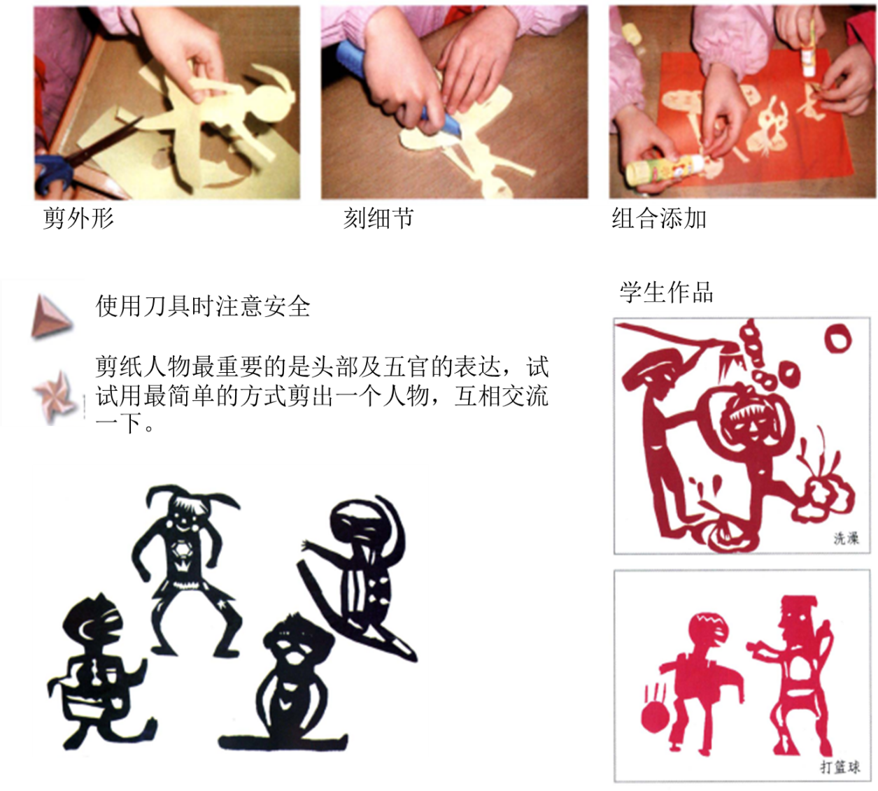 设计与制作(剪刻几个人物,将他们组合成故事,粘贴在底纸上)。