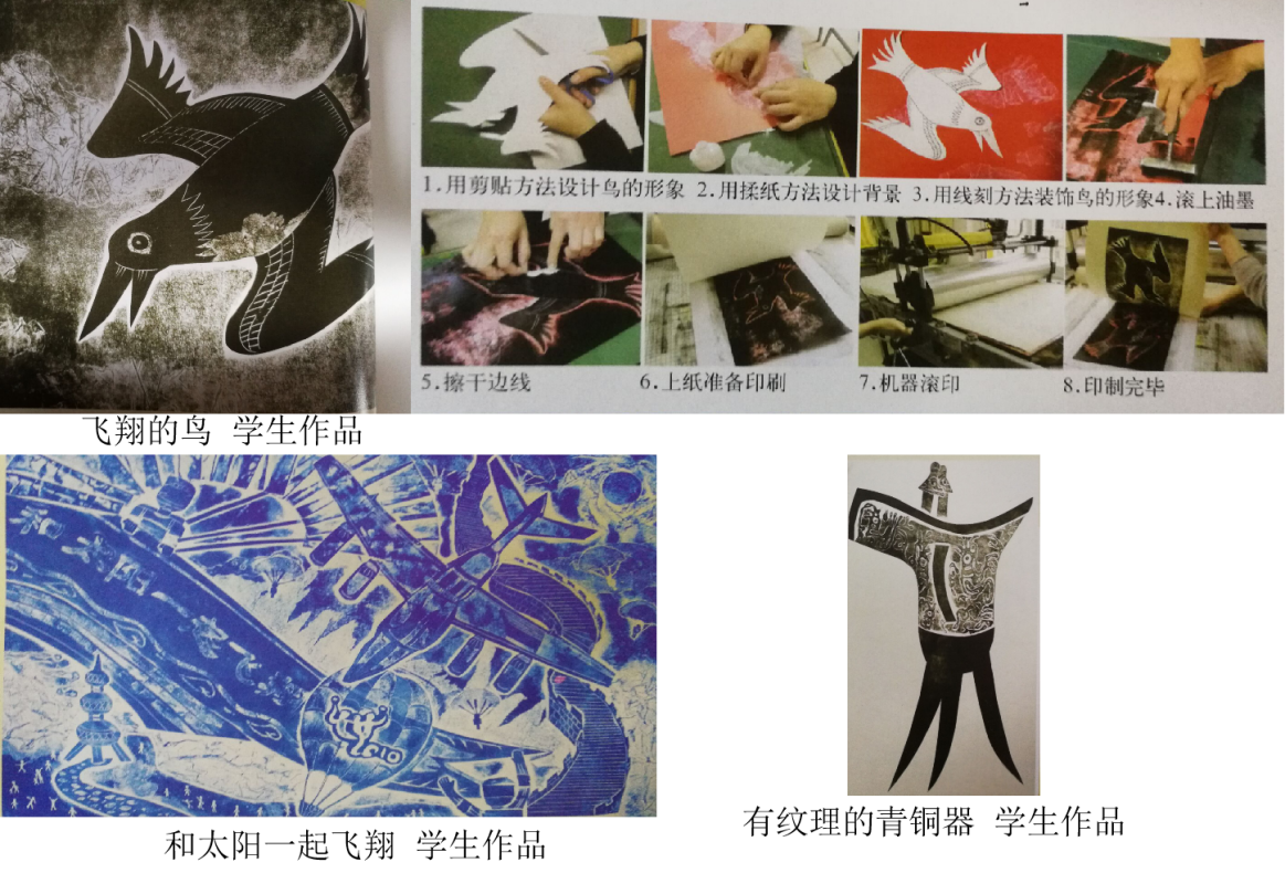 教师以“飞翔的鸟”为主题示范纸版画创作步骤。