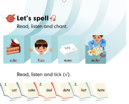 2. Play the finger show with the students to consolidate the words. For example, finger 1 refers to “cake”, and finger 2 refers to “face”. When the teacher points finger 1, the students should read “cake” loudly. The rest could be done in the same manner.