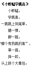 师:小朋友们都听到,小蚱蜢是跳着走路的,它呀想学跳高呢,那在儿歌里
