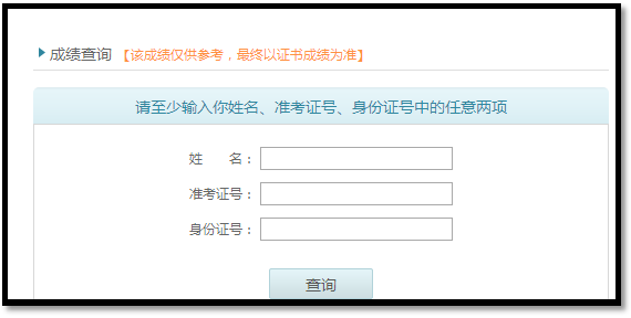 在“成绩查询”栏目中录入姓名、准考证号和身份证号码中的任意两项进行查询,查询结果页面如下图: