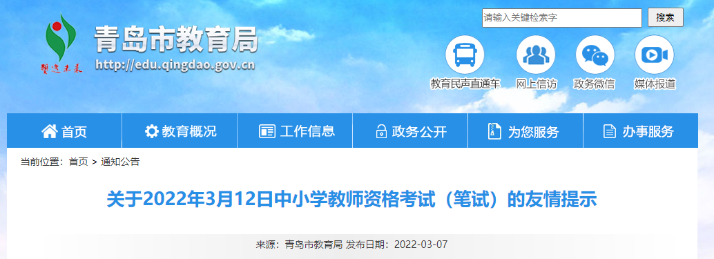 关于2022年3月12日青岛市中小学教师资格考试(笔试)的友情提示