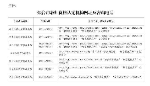 申请认定幼儿园、小学或初级中学教师资格,应对照本公告“申请认定人员范围”规定选择相应户籍地、居住地、就读学校所在地或部队驻地,由县(市、区)人民政府教育行政部门(或行政审批部门)认定;申请认定高级中学、中等职业学校、中等职业学校实习指导教师资格,应对照本公告“申请认定人员范围”规定选择相应户籍地、居住地、就读学校所在地或部队驻地,由烟台市行政审批服务局认定。
