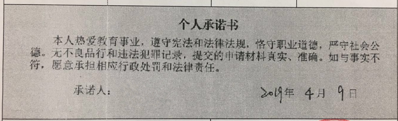 申请人在“中国教师资格网”首页“资料下载”栏目或在报名系统 “须知”页面下载《个人承诺书》。下载的《个人承诺书》用A4白纸打印。承诺书将合成在教师资格认定申请表上,请在“承诺人”处正楷书写签署本人姓名和签字日期后,扫描或拍照上传。签名后上传的《个人承诺书》,在预览《教师资格认定申请表》时可查看整体效果。如预览时发现上传的《个人承诺书》位置不正确、不清晰或签名不完整,务必重新上传,以免影响认定。
