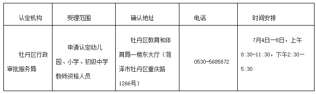 居住地、户籍地、就读学校所在地或部队驻地为菏泽市牡丹区、开发区和高新区的申请人,申请认定幼儿园、小学或初级中学教师资格,由菏泽市牡丹区行政审批服务局认定。