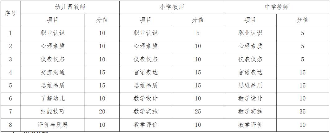 中小学教师资格考试面试满分100分,各项目分值具体如下(中职教师面试分值同中学教师):