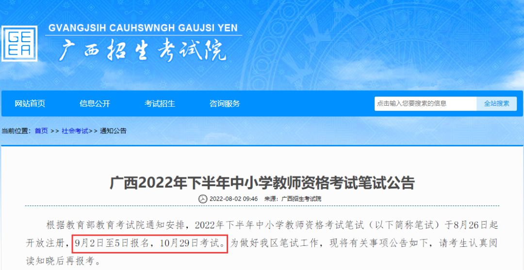 8月2日,广西招生考试院发布了22下教资笔试的考试时间安排,将于9月2日8:00开始进行笔试报名!