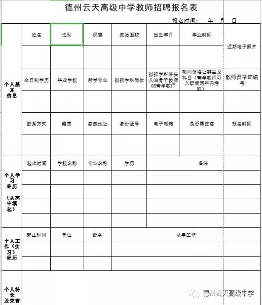 个人简历统一用表(即德州云天高级中学教师招聘信息报名表)格式如下,也可按照下图格式自行绘制填写。