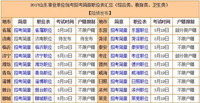 从2017山东事业单位统考简章职位表汇总看出,不限户籍的地市还是少数,所以各位考生要提前弄清楚各地市考情,以免报考失误。